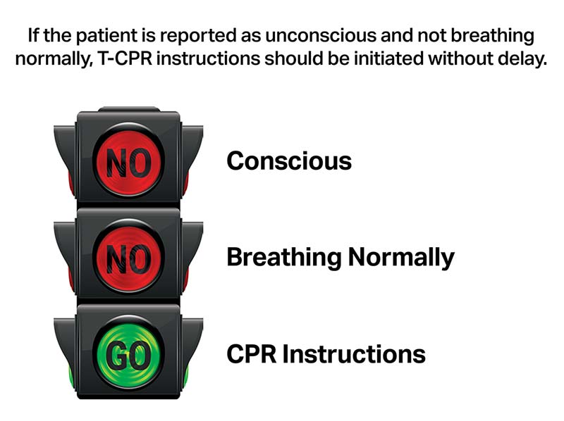 - When a caller describes an adult victim as unresponsive, with absent or abnormal breathing, telecommunicators should conclude that the victim is experiencing OHCA and should immediately provide T-CPR instructions.3,5 To address the variation in OHCA presentations, telecommunicators should be trained to identify OHCA across a broad range of circumstances, including agonal gasping and brief myoclonus.4