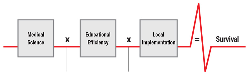 The development and implementation of resuscitation systems of care is founded on the Utstein Formula for Survival.1 The Utstein Formula holds that resuscitation survival is based on synergy achieved by the development and dissemination of medical science (ie, resuscitation guidelines based on the best available evidence); educational efficiency, which includes the effective training of resuscitation providers and members of the general public; and local implementation, which includes seamless collaboration between caregivers involved in all stages of resuscitation and post–cardiac arrest care (Figure 1). Parts 3 through 5 of the 2020 Guidelines represent the AHA’s creation of guidelines based on the best available resuscitation science. In “Part 6: Resuscitation Education Science,” the AHA critically evaluates the science of training medical professionals and the general public to assist a person in cardiac arrest. In “Part 7: Systems of Care,” we explore resuscitation topics that are common to the resuscitation of infants, children, and adults.